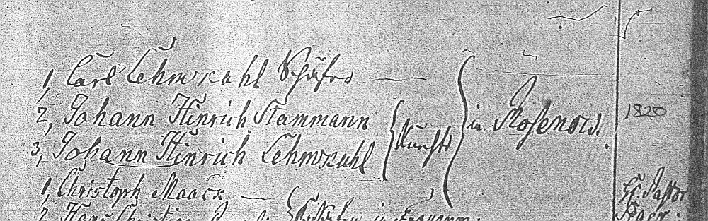 Den Geburtstagen folgen die Namen. Hier wird auch aufgeführt, dass sie in Rosenow, Kirchgemeinde Vietlübbe geboren wurden. Heinrich und Wilhelm wanderten in den 50er Jahren des 19. Jahrhunderts nach Wisconsin aus. Carl, Joachim und Christoph, die auch auswanderten, wurden nach 1819 geboren..