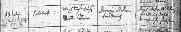| 19 July [1718] | Kalkhorst | [father] Ulrich Tiesenhusen, [mother] Mette Dassen | [child] Jurgen Anton Friederich | The last column lists three sponsors. This is the father of Johann Cuno Thiessenhusen. This grid format for recording baptisms, marriages, and deaths was common throughout Mecklenburg. (The same format was used for church records at the Evangelical & Reformed Church in New Berlin, Wisconsin in 1800s.) |