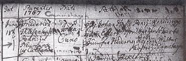 Taufe von Johann Cuno Thiesenhusen Baptism of Johann Cuno Thiesenhusen Cramonshagen Parish, Mecklenburg-Schwerin, 1767 | Juni 18, [1767, Taufe] | J. A. Friederich Thiesenhusen [Vater], Landbesitzer von Neumarck [wirklich so, Neinmark], [seine] Ehefrau [ux = uxor, Latiein] Catharina | Johann Cuno [(Conrad) außereheliches Kind] | In der letzten Spalte: die drei Paten, ihre Berufe und Dörfer. Zu jener Zeit war Latein die Sprache in der Kirche. Johann Cuno Thiessenhusen wurde in Neinmark (Cramonshagener Kirchengemeinde) geboren und zog - zwölfjährig - mit seiner Familie nach Rosenow, ein Dorf nah der Kirchgemeinde Vietlübbe Parish.