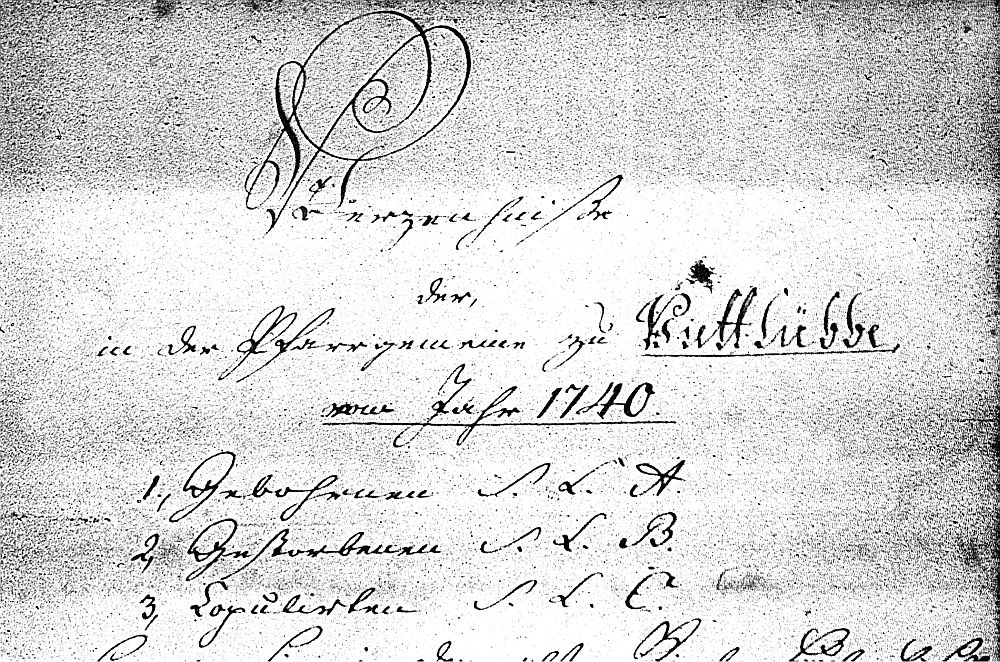 Die erste Seite aus dem Kirchenbuch in Vietlübbe The First Page of the Vietlübbe Parish Kirchenbuch, 1740 Der Titel der Seite: “Kirchenbuch der Kirchengemeinde Vietlübbe aus dem Jahre 1740.” Die folgenden zeilen weisen darauf hin, dass das Kirchenbuch Aufzeichnungen über 1. Taufe, 2. Begräbnisse und and 3. Trauungen beinhaltet. The gebräuchliche Handschrift wird "altdeutsche Schrift" oder "Fraktur" genannt. Der Pfarrer war einer der wenigen Leute, der schreiben konnte. Er hatte große Macht in der Kirche oder über das politische Leben seiner Gemeindemitglieder.