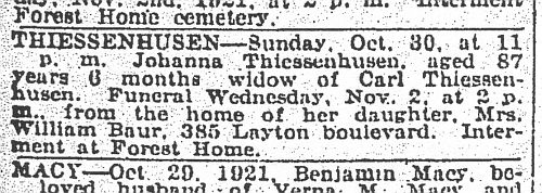 Death notice from the Milwaukee Sentinel newspaper October 1921.