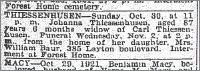 Zeitungsmitteilung zu ihrem Tode vom Milwaukee Sentinel im Oktober 1921.