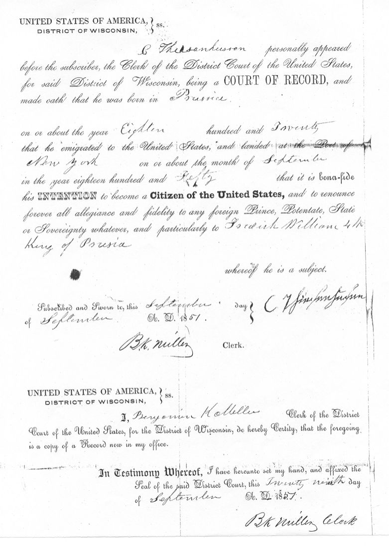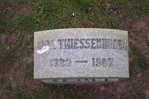 ... emigrated with his brother Heinrich in 1850. Settled in Milwaukee, Wisconsin. Carl, b. 1820 and Johanna, b. 1833 (Pamperien) Thiessenhusen had twelve children: Theodore, b. April 1854; Wilhelmine, b. June 1855; Ida, b. March 1857; Alvina, b. November 1858; Mary, b. June 1861; Albertina, b. April 1863; Rheinhold, b. November 1865; August, b. October 1866; Edward, b. December 1869; Albert, b. May 1872; Frank, b. September 1874; and Clara, b. July 1876. Carl and Johanna’s family lived in the city of Milwaukee. Carl was a tailor. Note: Most of the descendants Carl, Heinrich, and Christoph kept the traditional Mecklenburg spelling of their family name: “Thiessenhusen.” The descendants of Wilhelm and Joachim changed the spelling of their name to “Thiesenhusen.” Two families shortened their name to “Thiesen.” |