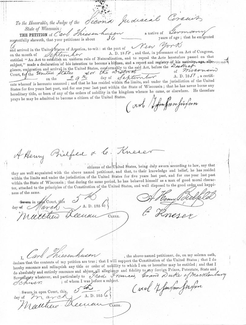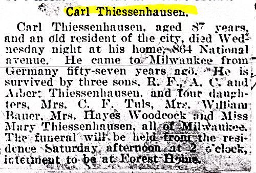 Dieser Artikel sagt aus, dass Carl Thiessenhusen ein Restaurant hatte, nachdem er nach Milwaukee kam. Hier zeigt sich, dass eine Familientradition in beruflicher Hinsicht fortsetzte. Später führte er ein Geschäft (vermutlich eine Schneiderei) und einen Saal in der National Avenue. Carl und Johanna lwohnten dort in der Hausnummer 864 nach 1860.