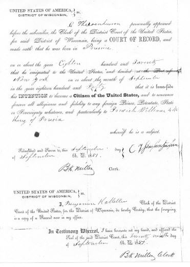 ... wanderte mit seinem Bruder Heinrich 1850 aus und siedelte sich in Milwaukee, Wisconsin an. Carl, geboren 1820 und Johanna, geboren 1833 (Pamperien) Thiessenhusen hatten 12 Kinder: Theodore, geboren April 1854 Wilhelmine, geboren Juni 1855 Ida, geboren March 1857 Alvina, geboren November 1858 Mary, geboren Juni 1861 Albertina, geboren April 1863 Rheinhold, geboren November 1865 August, geboren Oktober 1866 Edward, geboren Dezember 1869 Albert, geboren Mai 1872 Frank, geboren September 1874 und Clara, geboren Juli 1876. Carl und Johannas Familie lebte in der Stadt Milwaukee. Carl war Schneider. Beachte: Die meisten Nachkommen von Carl, Heinrich und Christoph behielten die Mecklenburger Schreibweise ihres Familiennamens bei "Thiessenhusen". Die Nachkommen von Wilhelm und Joachim änderten die Schreibweise ihres Namens in "Thiesenhusen". Zwei Familien kürzten ihre Namen auf "Thiesen". |