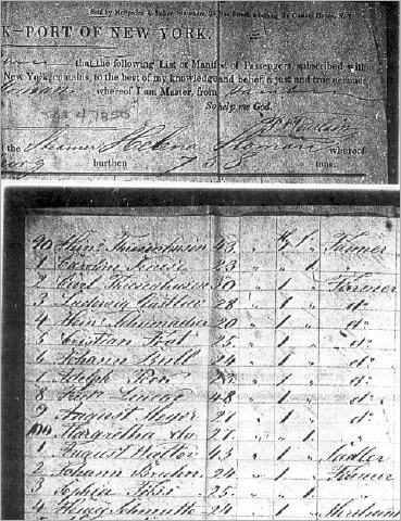 Before 1850, all ocean going vessels were powered only by the wind. The “Helena Sloman” was the first German steamship to make a transatlantic crossing. Carl and Heinrich Thiessenhusen, brothers, sailed on the ship’s second voyage. The trip from Hamburg to New York took 25 days; half the time it took on a traditional sailing ship. The “Helena Sloman” was an exciting advance in ship building, but it took tremendous desire and bravery to decide to cross the ocean on this type of unseasoned vessel. Carl and Heinrich Thiessenhusen departed Hamburg on 11 August 1850, and arrived in New York on 4 September 1850. |