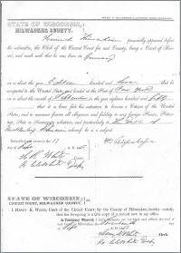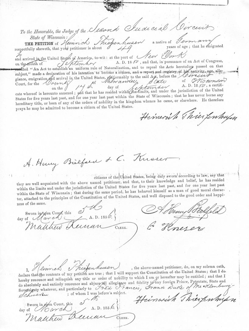 Letter of Intent from 1850 and page 2 of the Petition for Naturalization from 1856. Note his signatures. C. Kneser was a sponsor. Heinrich married Elisabeth Kneser in Germany.