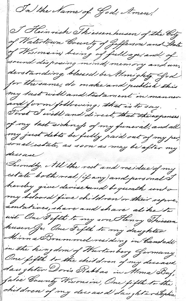 | Heinrich Thiessenhusen’s will names his children as heirs and his son-in-law, Daniel Kusel, Jr., as executor. |