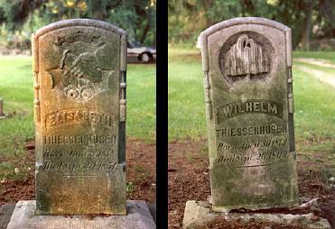 Elisabeth (Flägel) Thiessenhusen 1818-1871 und Wilhelm Thiessenhusen 1813-1863 sind auf dem Friedhof New Berlin Cemetery in der National Avenue, Waukesha County, Wisconsin, beerdigt. Nachdem Wilhelm in Folge einer Lungenenzündung starb, heiratete Elisabeth1863 wieder Johann Joachim Garbe.