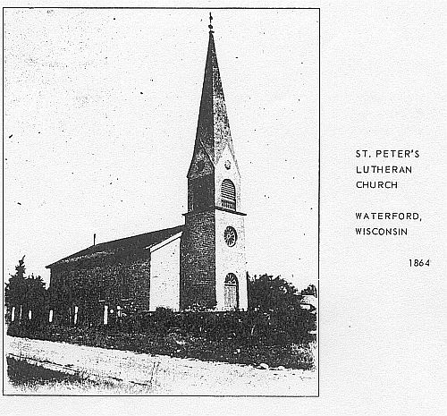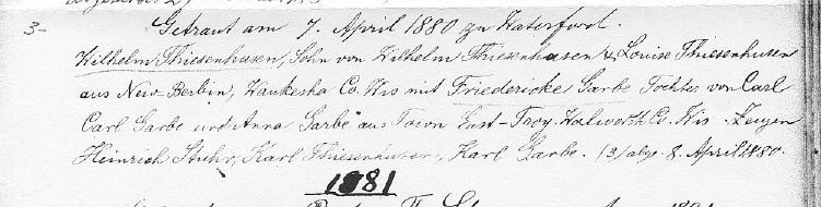 St. Peter’s Lutherische Kirche in der 124 North 3rd Street, Waterford, Racine County, Wisconsin. Dies war eine deutsche Kirchengemeinde, die die traditionelle It was a German parish that practiced the traditional “Augsburger Bekenntnis” Martin Luthers lehrte. William Thiesenhusen und Ricka Garbe heirateten hier am 7. April 1880. Beachte: Rickas Mutter hieß auch Elisabeth, nicht Louise, wie im Kirchenbuch geschreiben. Carl Garbes Familie lebte 1880 in East Troy.