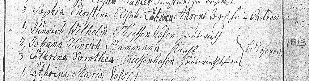 Wilhelm Thiessenhusen Taufurkunde, Vietlübbe, 1813 (Inhalt) Baptism Record, Vietlübbe, 1813 (cont.) Die Paten bei Johann Wilhelms Taufe waren: 1.) Heinrich Wilhelm Thiessenhusen, 2.) Johann Heinrich Stammann und 3.) Catharina Dorothea Thiessenhusen , alle aus Rosenow.