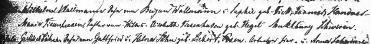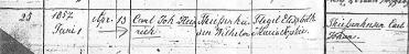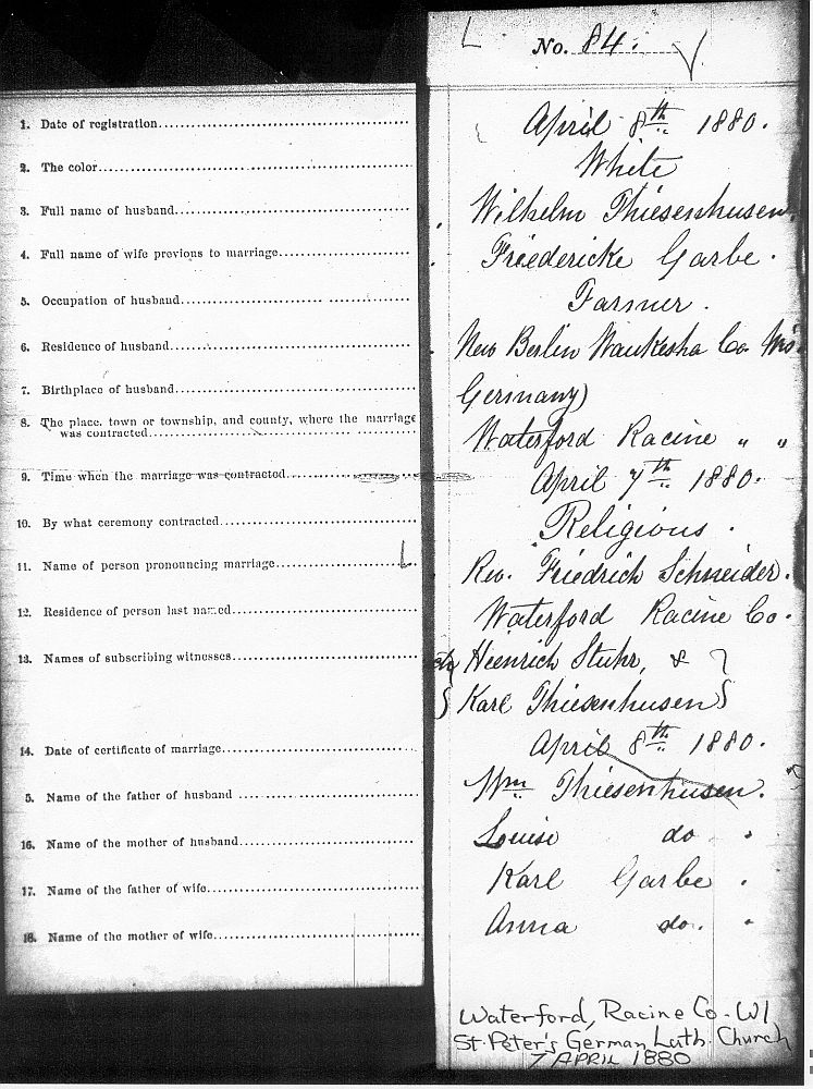 William und Rickas Trauung wurde von Rev. Frederick Schneider, St. Peter’s German Lutheran Church in Waterford, Wisconsin, vollzogen. (Die Originalkirche wurde dem Erdboden gleichgemacht und neu gebaut.) Beachte: Der name der Braut wurde in diesem Register mit “Friedericke” anstatt ihres Taufnamens “Henricke” vermerkt. Ihre Mutter war “Maria Sophia Elisabeth Flägel Thiessenhusen” , aber sie wird hier fälschlicherweise “Louise” genannt. Die Trauzeugen sind Heinrich Stuhr, Rickas Onkel und Carl Thiessenhusen, Williams Onkel.