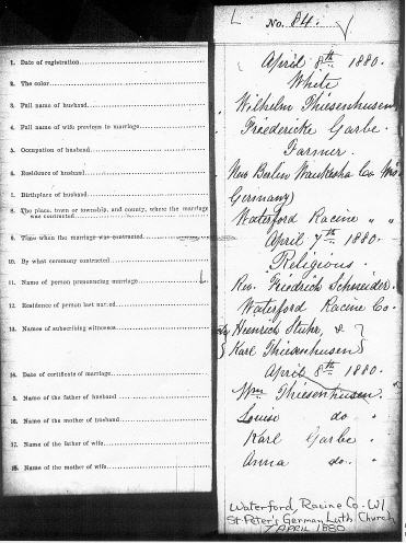 William and Ricka’s wedding was performed by Rev. Frederick Schneider of the St. Peter’s German Lutheran Church in Waterford, Wisconsin. (The original church was razed and rebuilt.) Note: The bride’s name is recorded in this civil record of the wedding as “Friedericke” instead of her baptized name, “Henricke.” Her mother was “Maria Sophia Elisabeth Flägel Thiessenhusen,” but she is named here as “Louise” in error. The witnesses are Heinrich Stuhr, Ricka’s uncle, and Carl Thiessenhusen, William’s uncle. |