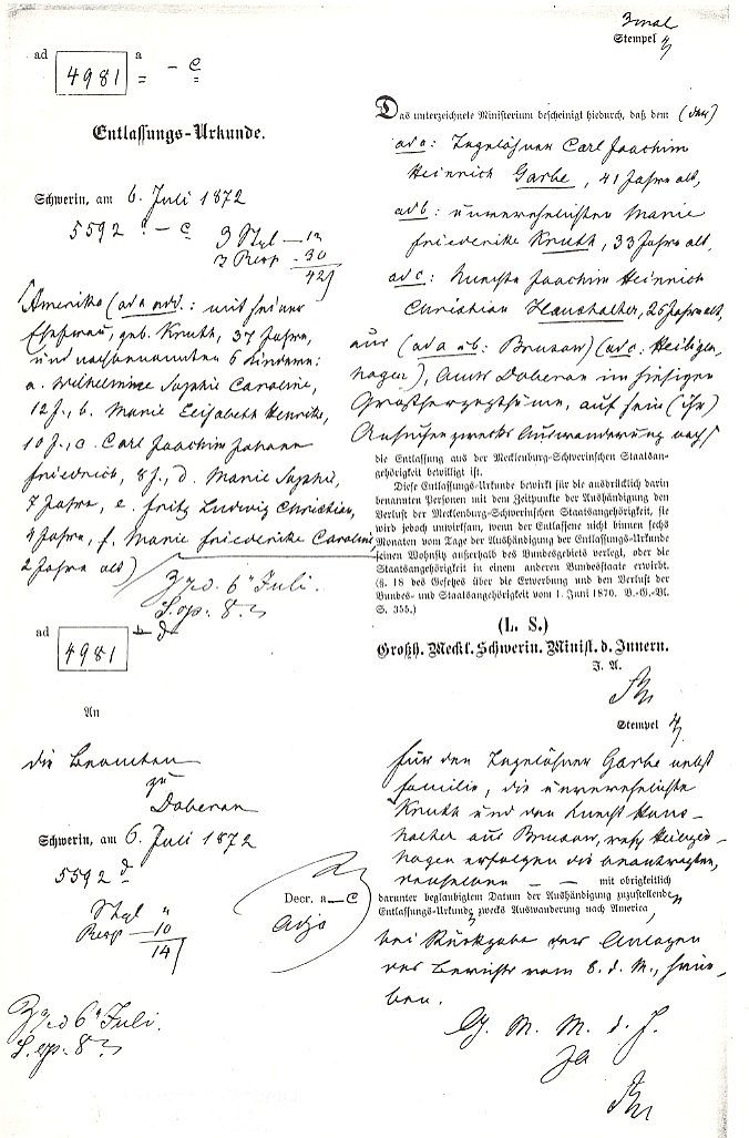 A permit to emigrate was needed to go to North America. This document was prepared by the Mecklenburg-Schwerin Ministry of the Interior on 6 July 1872 in Doberan. It names all members of the Carl Joachim Heinrich Garbe family, and two other individuals, in three groups. They planned to leave on 1 August 1872. Maria Elisabeth Henricka “Ricka” Garbe, born 22 January 1862, is listed as the second person in group “a.” She became William Thiesenhusen’s wife. Marie Kruth in group “b” is Anna Kruth Garbe’s sister, future wife of Carl Garbe’s brother Johann Joachim Heinrich Garbe. |