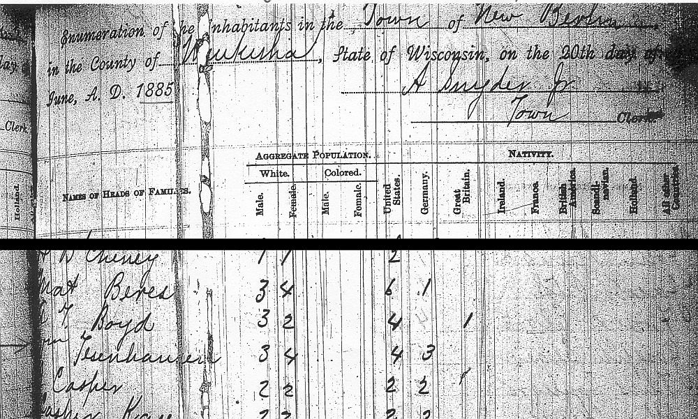 William Thiesenhusen Family Wisconsin State Census, New Berlin, 1885: “Wm. Tesenhausen” (sic) household - three males and four females; four born in the United States and three born in Germany. – This census record identifies: William and Ricka Thiesenhusen; their three children Ella, William, and Amanda; and Marie Garbe and her son Henry, who were living together in the Garbe log cabin on Calhoun Road. (Their neighbors included the Mat Beres and George Boyd families.) |