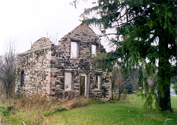 William and Ricka Thiesenhusen and family lived in this stone house on Small Road, New Berlin, Waukesha County, Wisconsin after 1887. It was probably built about 1860 or earlier. Three Thiesenhusen children, Ed b.1888, Meta b. 1890, and Rudy b. 1893, were all probably born here. This photo shows what remained of the stone house in 2001. |
