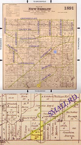 The original land that Wilhelm and Elisabeth Thiessenhusen (William’s parents) owned ( 1853 –1863) was in sections 14 and 23 just south of the National Avenue and Coffee Road juncture according to early plat maps. (Highlighted in blue on this later, 1891 plat map.) William and Ricka and family lived on the Johann Joachim Heinrich (Henry) Garbe farm in section 33 from about 1880 to 1887. William Thiesenhusen purchased his own 60 acre farm in sections 33 & 34 in 1887. (His land is identified by name on this map and highlighted in yellow.) William and Ricka Thiesenhusen lived in the stone house on the north side of the Small Road from about 1887 to 1895. They built a new farm house on the south side of Small Road about 1895. Later land purchases increased the size of their farm in New Berlin and Muskego |